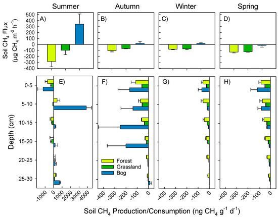 In situ CH4 fluxes ranged from −413 to +778 µg CH4 m−2 h−1 (Figure 3A–D). Absolute fluxes, either positive or negative, were greatest in summer compared to other seasons. Patterns with depth were similar across three seasons. Forest and grassland soils mostly consumed CH4 throughout the year (Figure 3A–D), while bog soils were net producers of CH4 in three of four seasons (Figure 3A–C). Most soils (including bog) showed net CH4 consumption (across all depths; Figure 3E–H). In summer, we found large CH4 production in bog soils (3838 µg CH4 g−1 d−1) at 5–10 cm depth (p = 0.003), and moderate CH4 production at 25–30 depth ranging from 87 to 704 µg CH4 g−1 d−1 (Figure 3E). Expressed in CO2 equivalents, negative CH4 fluxes (CH4 consumption) offset CO2 emissions by 54 to 56% for grassland and forest soils, respectively (Table 1). CH4 emissions from bog soils, however, added an additional 40% of CO2 equivalents.