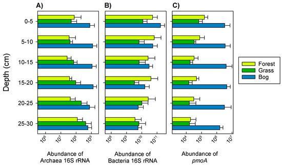 Abundance of archaeal (A) and bacterial (B) 16S rRNA genes, and pmoA (C) per g of dry soil. Means and standard error are shown (n = 4) for all samples.