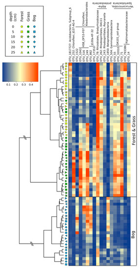 Across all soils, Illumina sequencing resulted in 440,504 archaeal, 24,293,004 bacterial, and 2,258,405 pmoA sequences. Clustering soil communities across vegetation and depth showed distinct differences in bacterial 16S rRNA genes between the forest/grassland and bog soils, with forest and grassland soils being more similar to each other (Figure 5). In the bog soils, Betaproteobacteria (OTU-1850) and OTU-1522 were more abundant than in forest and grassland soils (Figure 5). Contrastingly, Rhizobiales (OTU-78) and OTU-71 differentiated the forest/grassland from bog soils. A few OTUs were uniquely abundant in grassland soils, like the Chloroflexi group (especially OTU-252, OTU-1043, OTU-249). Across all depths, bog soils had greatest diversity of 16S rRNA compared to the forest and grassland soils (Figure S3). More specifically, bog soils had 10% and 42% greater Shannon diversity and richness (H’ and S) than the forest and grassland soils (p < 0.001).
