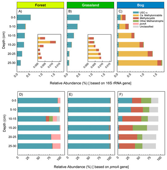 Dominant methanotroph groups detected in the forest (A,D), grassland (B,E), and bog (C,F) soils, based on relative abundance of 16S rRNA and pmoA genes, top and bottom panels, respectively. Inset graphs in A and B show abundance for each corresponding depth but at smaller X-axis scale. USCα was identified by blast as described in the methods. Methylocystis and Ca. Methylomirabilis were identified based on the Silva classifications. Other methanotrophs include Methylomonas and Methylospira. pxmA refer to pmoA-like genes of uncertain function found in the genomes of various methanotrophs.