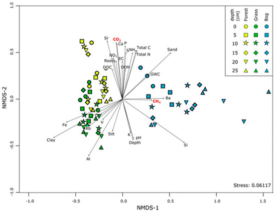 Non-metric multidimensional scaling (NMDS), similar to the clustering observed in Figure 5, showed a distinct difference in bacterial 16S rRNA genes among soil types and relationship to soil properties (p < 0.05, Figure 7). Bacterial communities in all soils showed clear patterns with depth, but patterns with depth were most distinct in bog soils. Soil properties associated with organic matter (e.g., nitrogen, carbon, phosphorus, root biomass, DOC) all correlated well to surface (0–5 cm) bacterial communities across all vegetation types. CH4 production also correlated with depth of bog soils (Figure 7). Grassland community composition positively related to clay and Fe content of the soils, and negatively with soil moisture—these soils were the driest of the three soil types (Figure 7; Tables S2, S4 and S5). Bacterial communities were distinct in bog soils, and unsurprisingly correlated to water content, but also Ba content (and greater CH4 production).