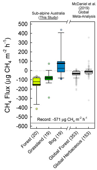 Hourly CH4 fluxes from this study’s forest, grassland and bog (from Figure 3A–D) soils compared to forest and herbaceous studies from a global meta-analysis [90]. The 10th and 90th percentiles are shown by bottom and top whiskers. The 25th and 75th percentiles are shown by the bottom and top of the box. Median is shown by the thin line, mean by the thick line, and outliers are circles. The number of measurements within each boxplot are shown in parentheses. Gray bar at −571 μg CH4 m−2 h−1 is the greatest CH4 oxidation rate (most negative flux) ever observed and published [91].