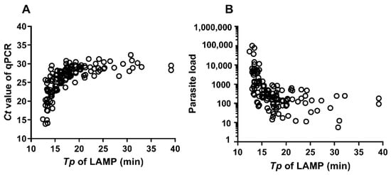 (A)Correlation (Spearman’s rank) between Loopamp Tp and qPCR Ct values. (B) correlation (inverse) between Loopamp Tp and parasite load. Ct: cycle threshold; qPCR: quantitative PCR; Tp: time-to-positivity; LAMP: Loopamp.