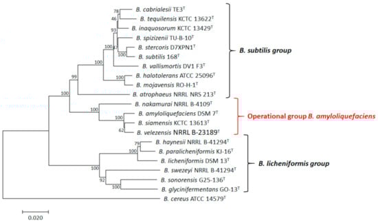 - Ngalimat, M.S.; Sabri, S. Taxonomic note: Speciation within the operational group Bacillus amyloliquefaciens based on comparative phylogenies of housekeeping genes. Asia-Pac. J. Mol. Biol. Biotechnol. 2020, 28, 19–26. [Google Scholar] [CrossRef]