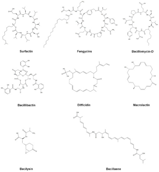 - Dunlap, C.A.; Bowman, M.J.; Rooney, A.P. Iturinic lipopeptide diversity in the Bacillus subtilis species group—Important antifungals for plant disease biocontrol applications. Front. Microbiol. 2019, 10, 1794. [Google Scholar] [CrossRef] [PubMed]