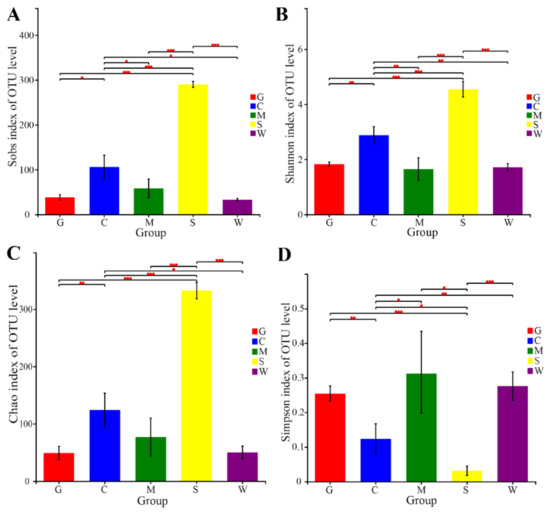 Comparison of alpha diversity indices of the bacterial communities at different sites. (A) Comparison of the Sobs index of the bacterial communities at different sites, (B) comparison of the Shannon index of the bacterial communities at different sites, (C) comparison of the Chao index of the bacterial communities at different sites, and (D) comparison of the Simpson index of the bacterial communities at different sites. Higher Sobs and Chao values indicate a higher richness; higher Shannon and lower Simpson values indicate a higher diversity. Statistical significances between two sites were considered at * p < 0.05, ** p < 0.01, and *** p < 0.001 by Welch t-test. G: gill mucosae (G1–G4); C: intestinal contents (C1–C4); M: intestinal mucosae (M1–M4); S: stomach contents (S1–S4); W: stomach mucosae (W1–W4).
