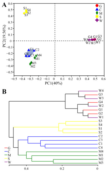 Analysis of the bacterial community structure at different sites. (A) Principal coordinate analysis based on the Bray-Curtis metric of the bacterial communities. The percentages indicate the relative contribution of the principal components. (B) The hierarchical clustering tree based on Bray-Curtis metric of the bacterial communities. G: gill mucosae (G1–G4); C: intestinal contents (C1–C4); M: intestinal mucosae (M1–M4); S: stomach contents (S1–S4); W: stomach mucosae (W1–W4).