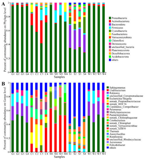 Distribution of the bacterial communities in all twenty samples at (A) the phylum level or (B) the genus level. G: gill mucosae (G1–G4); C: intestinal contents (C1–C4); M: intestinal mucosae (M1–M4); S: stomach contents (S1–S4); W: stomach mucosae (W1–W4).