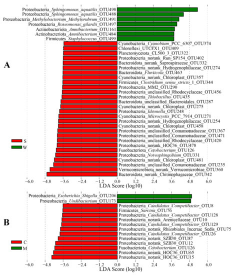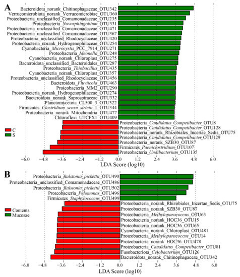 (A) LEfSe showing differences in the bacterial communities at the OTU level between the stomach contents and contents. (B) LEfSe showing differences in the bacterial communities at the OTU level between the content (C and S) and mucosa (G, M, and W) samples. The highlighted taxa are enriched in the group that corresponds to each color. LDA scores can be interpreted as the degree of difference in the relative abundance of OTUs.