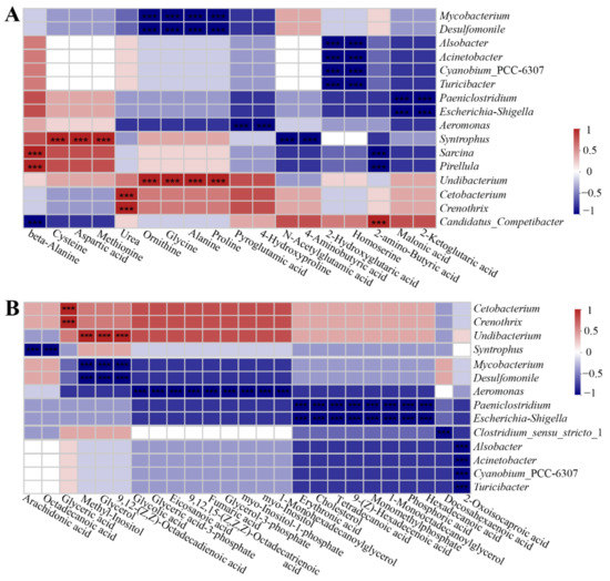 The significant correlation between intestinal main bacterial genera and metabolites. (A) The correlation of intestinal bacteria and amino acid-related metabolites. (B) The correlation of intestinal bacteria and lipid-related metabolites. The correlation coefficient is represented by different colors (red: positive correlation; blue: negative correlation). * Represents significantly negative or positive correlations (*** p < 0.001).