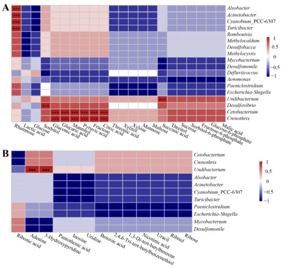 The significant correlation between intestinal main bacterial genera and metabolites. (A) The correlation of intestinal bacteria and carbohydrate-related metabolites. (B) The correlation of intestinal bacteria and other metabolites. The correlation coefficient is represented by different colors (red: positive correlation; blue: negative correlation). * Represents significantly negative or positive correlations (*** p < 0.001).