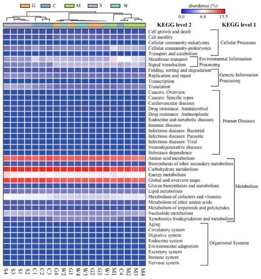 Heatmap profiles showing the functional categories (Kyoto Encyclopedia of Genes and Genomes (KEGG) level 1 and level 2) of the bacterial communities, as predicted by the Phylogenetic Investigation of Communities by Reconstruction of Unobserved States (PICRUSt2) analysis. The functional clustering analysis is based on the unweighted pair-group method with arithmetic means (UPGMA). Rows represent the KEGG Orthology (KO) functions, columns represent the 20 samples, and the color intensity in the heatmap represents the relative abundance (%) of the functional categories. G: gill mucosae (G1–G4); C: intestinal contents (C1–C4); M: intestinal mucosae (M1–M4); S: stomach contents (S1–S4); W: stomach mucosae (W1–W4).