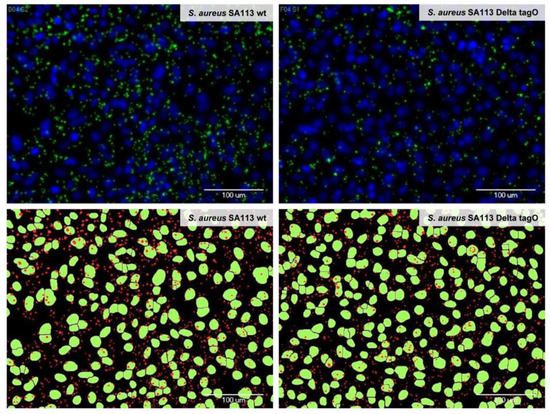 Identification of adherent bacteria by automated microscopy and image analysis. Adhesion of wild type Staphylococcus aureus SA113 (left) and S. aureus SA113 Delta tagO (right) to A-549 cells is depicted. Cell nuclei were stained with DAPI (upper panel, blue and lower panel, green) and bacteria were stained with a primary antibody against teichoic acid and an Alexa 488-labeled secondary antibody (upper panel, green and lower panel, red). Upper panel: Images acquired with the automated microscope after washing and staining; lower panel: Bacterial and epithelial cell areas as identified by the imaging software MetaXpress with the module “Transfluor” and the mode “Vesicle area per cell”, based on the microscopic images shown in the upper panel. A bacterial density of OD600 = 0.1 has been used (for quantification please refer to Figure S1).