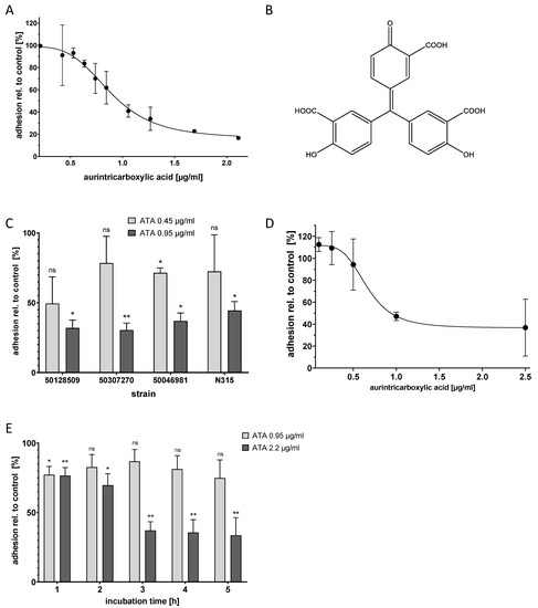 To analyze the activity of ATA towards different S. aureus strains, three clinical isolates of S. aureus were used, strain 50,307,270 (rifampicin resistant), strain 50,128,509 (MRSA), and strain 50,046,981 (MSSA). ATA could inhibit the adhesion of all strains with a potency that was equal to or higher than that found for N315 (Figure 2C).