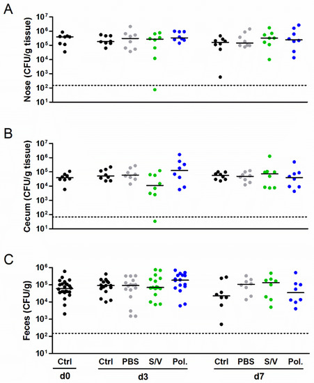 Stool samples were adjusted to 0.2 g/mL with sterile PBS followed by homogenization for 20 min at 1400 rpm and 4 °C using a Thermo Mixer C shaker (Eppendorf, Hamburg, Germany). The nose and cecum were weighed, transferred to autoclaved homogenizer tubes containing zirconium oxide beads (diameter: 1.4/2.8 mm, Precellys, France), and filled up with 1 mL sterile PBS. Cecum samples were homogenized at 6000 rpm for 2 × 20 s with a 15 s interval. Noses were homogenized at 6500 rpm for 2 × 30 s with a 5 min interval. Homogenized samples were serially diluted; 10 µL of each dilution were plated out in triplicate on S. aureus Chromagar plates (CHROmagar, France) and enumerated the next day.