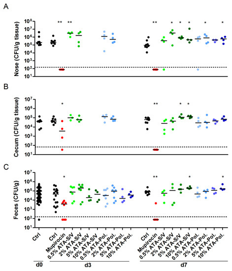 Mupirocin eradicated S. aureus colonization, while ATA was not effective. Female C57BL/6N mice were colonized intranasally with 0.7–1.0 × 108 CFU S. aureus JSNZ. After three days of colonization, mice were treated on a daily basis for 7 days with 10 µL 2% Mupirocin or ATA in different concentrations (0.5%, 2.5%, 5% or 10%) using Softisan 649/Vaseline or Poloxamer 407 as drug carrier. Groups receiving 5% or 10% ATA were only analyzed at day 7. A control group remained untreated. The S. aureus bacterial load was determined in the homogenized nose (A), cecum (B), and feces (C) 0, 3, and 7 days after starting the treatment. The detection limit is indicated by a dashed line; medians are indicated. Data were pooled from two independent experiments with 4 mice/group. Statistics: Groups were compared with Ctrl using Mann-Whitney test, * p < 0.05, ** p < 0.01. Abbreviations: Ctrl—control; Pol.—Poloxamer 407; S/V—Softisan 649/Vaseline 9:1 (w/w).