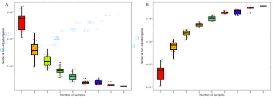 Nine metagenomic libraries were constructed. The nine libraries analyzed with the Illumina HiSeq platform gave between 2.5 and 3.4 million sequences in each sample (Table S1). Based on quality control methods, all pollution data were removed, and approximately 6432 M bp per sample were acquired. About 116,748 Scaftigs per sample were assembled with an average length of 1358 bp. A total of 1,153,732 ORFs were obtained, and the average length of each ORFs was 755 bp. Of these, 754,099 ORFs were successfully annotated. The GC content of each sample was between 30% and 55%. The N50 value was between 1185 and 3686 bp for the samples. In the core-pan gene analysis, as shown in Figure 1, the number of non-redundant genes decreased with the increase in the sample number in the core-gene curve, whereas it increased with the increase in the sample number in the pan-gene curve. These results support that the further detailed analysis of metagenome sequencing data was reliable.