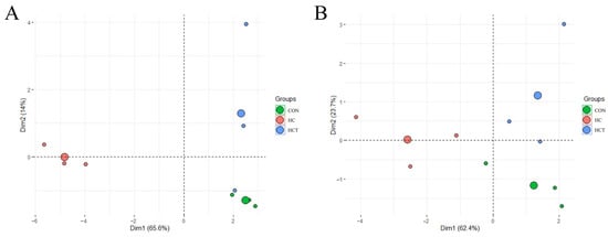 Principal component analysis on the profiles of carbohydrate-related (A) microorganisms and (B) enzymes in control (CON), high-concentrate diet (HC), and high-concentrate diet supplemented with 200 mg of thiamine/kg of DMI (HCT) treatment.