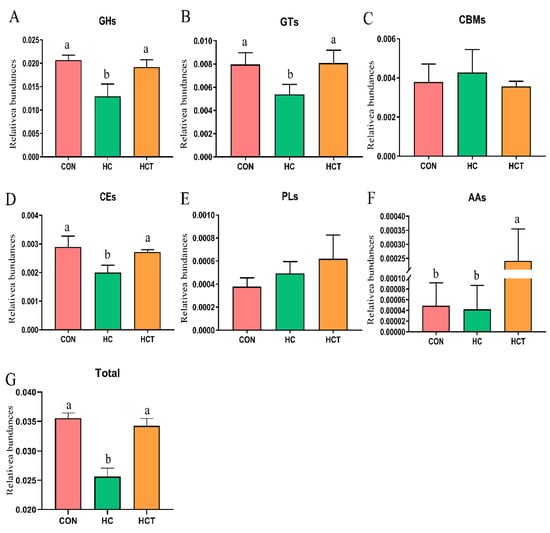 Further differential analysis of the data revealed the effects of the three treatments on CAZymes. The results were shown in Figure 3. A lower relative abundance of glycoside hydrolases (GH), glycosyl transferases (GT), carbohydrate esterases (CE), and total CAZymes were found in the goats fed with high-concentrate diets when compared with those on the CON treatment (p < 0.05). However, these changes caused by high-concentrate diets were reversed by the HCT treatment and increased the relative abundance of auxiliary activity (AA; p < 0.05). In addition, there were no significant differences (p > 0.05) in the relative abundance of the other CAZymes, including the carbohydrate-binding modules (CBM) and polysaccharide lyases (PL) among the three dietary treatments.