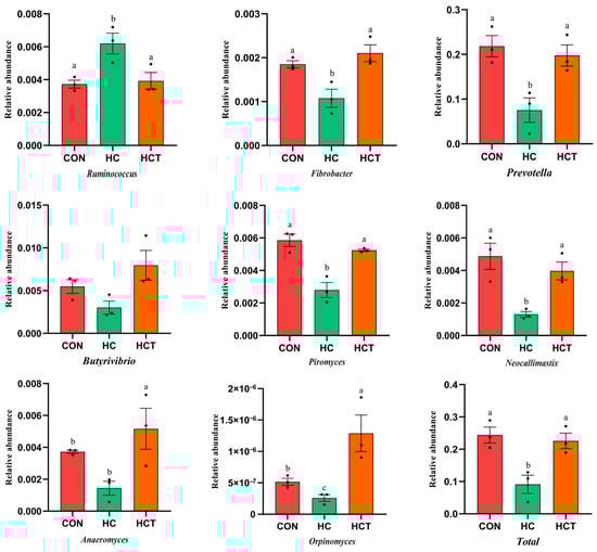 In order to analyze the microorganisms related to carbohydrate digestion, we filtered the unrelated microorganisms, found the genus level of the related microbiota, and analyzed the differences according to the previous relevant reports [24,25,26]. As shown in Figure 4, compared with the CON treatment, the relative abundance of the fiber-degrading microorganisms (Fibrobacter, Prevotella, Piromyces, Neocallimastix, and Orpinomyces) was significantly decreased in the HC group (p < 0.05). The HCT treatment significantly increased the relative abundance of Fibrobacter, Prevotella, Piromyces, Neocallimastix, Anaerpmyces, and Orpinomyces, but significantly decreased the relative abundance of Ruminococcus compared to the CON treatment (p < 0.05). Moreover, the total relative abundance of the fiber-degrading microorganisms was increased by the HC treatment. Similarly, starch degrading bacteria were affected differently by the diet, as shown in Figure 5. The relative abundance of Lactobacillus, Streptococcus, Bacteroides, Eubacterium, Succinimonas, Anaerovibrio, and Veillonella in the HC treatment were higher than that in the CON and HCT treatments (p < 0.05), whereas Lactobacillus, Streptococcus, Bacteroides, Eubacterium, Succinimonas, and Veillonella were similar (p > 0.05) between the CON and HCT treatments. The HC treatment reduced the relative abundance of Bifidobacterium and Lactococcus compared to the CON treatment, but the HCT treatment conversely increased the relative abundance of Bifidobacterium and Lactococcus compared to the HC treatment (p < 0.05). In addition, compared with the HC treatment, the total relative abundance of starch-degrading microorganisms was increased by the HCT treatment (p < 0.05).