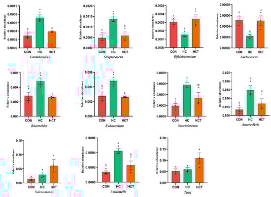Effects of high-concentrate diet and thiamine supplementation treatment on the relative abundance of starch-degrading microorganism. (a–c) Means with different letters differed significantly (p < 0.05). CON: Control diet; HC: High-concentrate diet; HCT: High-concentrate diet supplemented with thiamine.