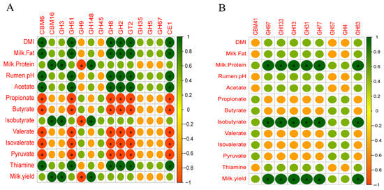 Our previous study reported the effect of thiamine on animal performance and rumen fermentation parameters, and these data are shown in Tables S3 and S4 [6]. Due to the close relationship between carbohydrate enzymes and animal production performance, their association may help us better understand their internal relationship. Hence, the Spearman correlation analysis was conducted between CAZymes and ruminal pH, VFAs, DMI, milk quality, milk yield, and thiamine content. The results of the network analysis showed that there were complex associations between carbohydrate enzymes and animal performance. The correlation analysis between fiber-degrading enzymes and animal performance was presented in Figure 6A, in which the relative abundance of CBM6, GH51, GH8, GH2, GT2, and CE1 was positively correlated with DMI, milk fat, ruminal pH, acetate, and thiamine (r > 0.5, p < 0.05), while they had negative correlations with propionate, butyrate, valerate, isovalerate, and pyruvate proportions (r < −0.5, p < 0.05). The relative abundance of CBM16, GH3, and GH148 was positively correlated with milk protein, milk yield, and isobutyrate (r > 0.5, p < 0.05). The relative abundance of GH9 was negatively correlated with milk protein, milk yield, isobutyrate (r < −0.5, p < 0.05). As shown in Figure 6B, for starch-degrading enzymes, the relative abundance of GH97, GH133, GH13, GH31, GT3, GH77, and GH63 was positively correlated with milk protein, milk yield, isobutyrate (r > 0.5, p < 0.05).