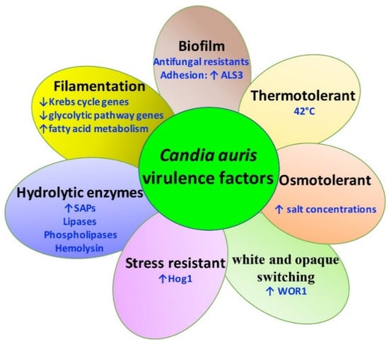 Like C. albicans, C. auris expresses several virulence factors that contribute to pathogenesis including the transition between blastoconidia and filamentous forms, hydrolytic enzyme production, thermotolerance, biofilm/adhesion to host cells, osmotolerance, filamentation, and phenotypic switching (Figure 2).
