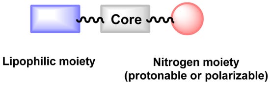 From a chemical point of view, it has to be mentioned that the chemical diversity of reported antifungal active against C. auris is quite low. Only 30 repositionable compounds have been described for their activity against C. auris and most of them can be gathered based on common chemical features: quinoline/isoquinoline, guanidine, phenothiazine/benzothiepine or amide-based cores. These cores are decorated with protonable/polarizable nitrogen groups (pyridine, ternary amine, ammonium, piperazine) and lipophilic moieties (fatty chain or halogenated aromatics). This could be summarized as followed in Figure 5. The protonable nitrogen could be part of the core moiety as in quinoline/isoquinoline derivatives.