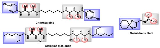 Concerning the guanidine derivatives, the same features are also represented (Figure 6). The guanidine core serves also as the protonable part. From a descriptor point of view, these compounds are not blood brain barrier (BBB) permeants. The bis-biguanidines (chlorhexidine and alexidine) are quite lipophilic with logP equal to 2.79 and 4.67, respectively. However, guanadrel is quite balanced (logP = 0.59). The three drugs exhibited high TPSA (82.86 to 167.58 Å).
