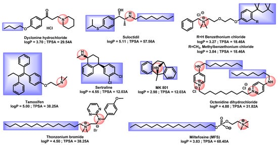 All others repositionable compounds except artemisin and hexaclophene exhibited a nitrogen protonable group or a quaternary ammonium coupled with a lipophilic moiety even if no common core can be distinguished (Figure 7). Their logP ranged from 2.98 to 5.11, proving their lipophilicity.