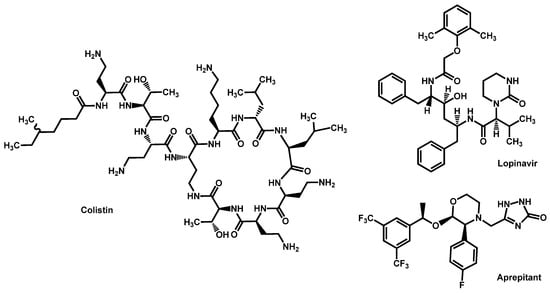 Structure of Colistin, Lopinavir and Aprepitant.