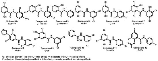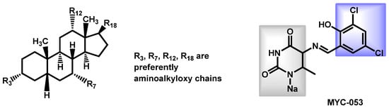 Using medicines for malaria venture’s pathogen box, Wall et al. recently confirmed iodoquinol and miltefosine as potent inhibitors of C. auris strain 0390, both under planktonic and biofilm growing conditions (Figure 4) [57]. Both compounds possess broad-spectrum of activity against Candida spp., including multiple strains of the emergent C. auris, irrespective of their resistance profiles. Miltefosine (MFS) was also reported in combination with amphotericin B [58]. In the last few months, Barreto et al. confirmed the interest of MFS as an alternative approach to fight against the emerging fungus C. auris [59]. They reported its fungicidal activity against planktonic cells of C. auris clinical isolates, and antibiofilm ability. They also studied the encapsulation of MFS in alginate nanoparticles (MFS-AN). Using a Galleria mellonella larvae infected by C. auris model, they demonstrated that both MFS and MFS-AN were able to increase the survival rate. The main advantage of MFS-AN over MFS was its reduced toxicity.