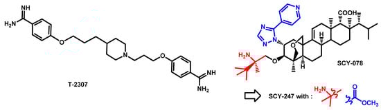 - Nishikawa, H.; Sakagami, T.; Yamada, E.; Fukuda, Y.; Hayakawa, H.; Nomura, N.; Mitsuyama, J.; Miyazaki, T.; Mukae, H.; Kohno, S. T-2307, a novel arylamidine, is transported into Candida albicans by a high-affinity spermine and spermidine carrier regulated by Agp2. J. Antimicrob. Chemother. 2016, 71, 1845–1855. [Google Scholar] [CrossRef]