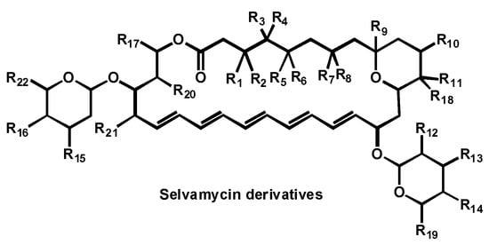 - Van Arnam, E.; Sit, C.S.W.; Ruzzini, A.C.; Clardy, J.C.; Currie, C.; Pinto-Tomas, A.A. Antifungal compounds comprising selvamicin and anologs. PCT Int. Appl. (2017) WO 2017210565 A1 20171207, 7 December 2017. [Google Scholar]