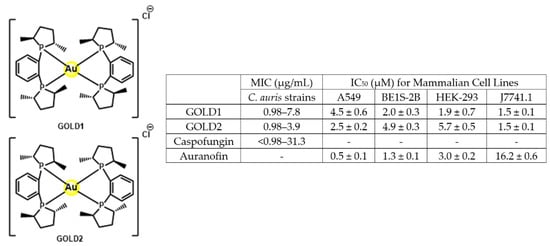 - Dennis, E.K.; Kim, J.H.; Parkin, S.; Awuah, S.G.; Garneau-Tsodikova, S. Distorted Gold(I)-Phosphine Complexes as Antifungal Agents. J. Med. Chem. 2020, 63, 2455–2469. [Google Scholar] [CrossRef]