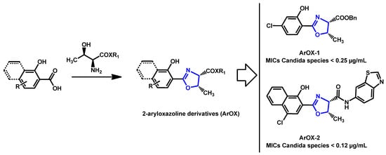 - Argomedo, L.; Barroso, V.M.; Barreiro, C.S.; Darbem, M.P.; Ishida, K.; Stefani, H.A. Novel 2-Aryloxazoline Compounds Exhibit an Inhibitory Effect on Candida spp. Including Antifungal-Resistant Isolates. ACS Med. Chem. Lett. 2020, 11, 2470–2475. [Google Scholar] [CrossRef]