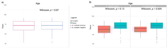 Age of A. schaalii-positive and -negative patients. Figure 1 shows the difference between A. schaalii-positive and -negative patients (A), and males and females (B). Legend between pictures is common for both. Wilcoxon rank-sum test was used to reveal differences between two selections (p-values are in plots). (A) No difference between the age of A. schaalii-positive and -negative patients was revealed. (B) No difference in A. schaalii-positive males’ and females’ age was observed (left side, p = 0.13), but, A. schaalii-negative males were significantly older than females (right side, p = 0.029).
