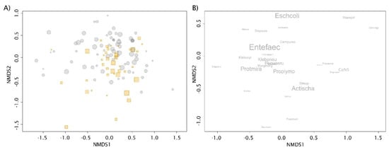 Non-Metric Multidimensional Scaling (NMDS) ordinations. (A) NMDS ordination of 128 patients according to their species composition (stress = 0.18). Positive (orange squares) and negative (grey circles) A. schaalii patients are distinguished. A. schaalii was excluded from the species data set and was treated as an explanatory variable. The symbol size is proportional to richness (number of bacteria detected in the patient). Patients from both groups were partly separated, but the groups overlapped. This indicates the species composition did not differ much between the groups. (B) Bacteria positioned in NMDS ordination of samples as weighted sample score averages (stress = 0.18). This NMDS diagram was created to display the relationships between species, including A. schaalii. Only high-diversity patients (those with at least four bacteria) and non-rare species (those with at least five occurrences) were kept to calculate the ordination. This led to the elimination of extreme cases represented by rare species and patients with a low number of detected representatives. The font size is proportional to the occurrence frequency in the studied population.