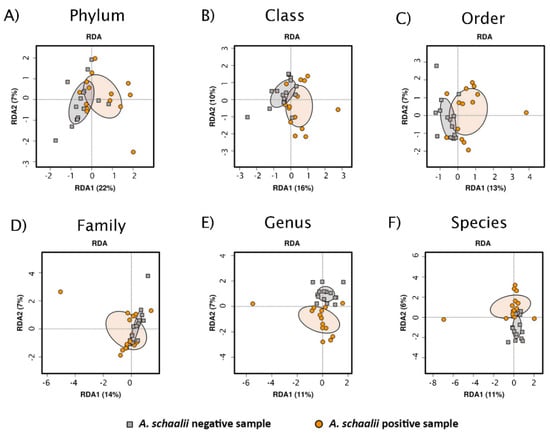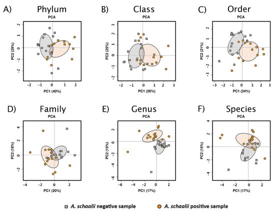 Principal Component Analysis (PCA) biplots with A. schaalii presence/absence projected. PCA biplots showed unsupervised ordinated sample clustering of different taxonomic ranks (A–F), A. schaalii presence/absence was projected and 95% confidence interval was depicted by filled ellipses. The clustering according to a projected variable was visible, most apparently at the genus level (E), although the explained variability increased with higher taxonomic ranks (compare explained variability from species (E) to phylum level (A)).