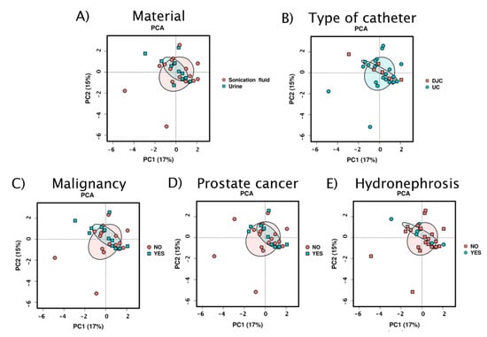 Besides Age, Sex, Type of catheter (DJC vs. UC), and Material (urine vs. sonication fluid), data about 3 diagnoses: hydronephrosis, malignant prostate neoplasm (prostate cancer), and any malignancy, entered further analyses because of a sufficient number of cases (metadata see in Supplementary Table S4).