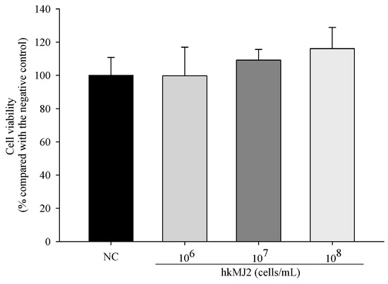 To investigate the cytotoxicity of hkMJ2 in hFOB 1.19 cells, their viability was measured by the MTT assay. The viabilities of cells treated with hkMJ2 (1 × 106, 1 × 107, or 1 × 108 cells/mL) did not show a significant reduction (Figure 1). Therefore, we used hkMJ2 at concentrations of 1 × 106, 1 × 107, and 1 × 108 cells/mL in this study.