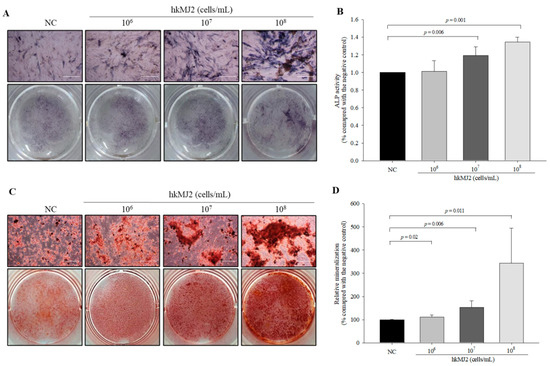 To investigate the effect of hkMJ2 on osteoblast differentiation, we analyzed ALP activity, a relatively early stage marker of osteoblast differentiation. Although ALP activity in cells treated with 1 × 106 cells/mL hkMJ2 did not increase significantly, ALP activities in cells treated with 1 × 107 and 1 × 108 cells/mL hkMJ2 were increased significantly compared with the negative control (Figure 2A,B). These results suggested that hkMJ2 stimulated induction of osteoblast differentiation. To investigate whether hkMJ2 induced terminal osteoblast differentiation, the degree of mineralization was measured using alizarin red S that forms a red complex with calcium. Formation of red deposits was increased significantly in a dose-dependent manner with hkMJ2 compared with the negative control (Figure 2C,D). These results suggested that hkMJ2 increased osteoblast mineralization.