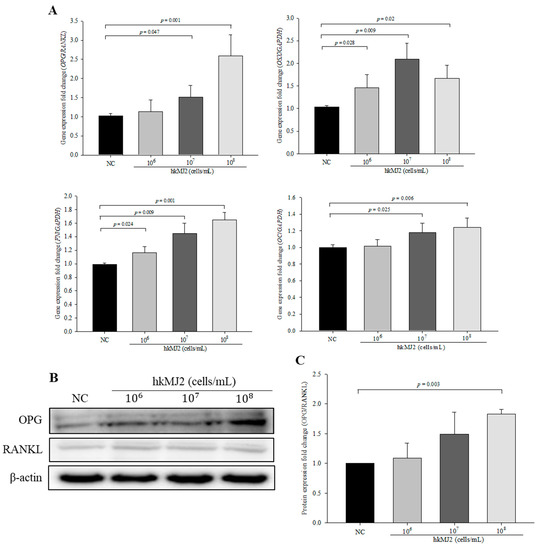 To investigate the effect of hkMJ2 on the expression levels of genes and proteins related to osteoblast differentiation, we performed qPCR and Western blots, respectively. Although the expression level of osterix (OSX) did not change in a dose-dependent manner, it was significantly increased in cells treated with hkMJ2 compared with the negative control. The expression levels of osteogenic genes including OPG/RANKL, fibronectin (FN), and osteocalcin (OC) were significantly increased in cells treated with hkMJ2 in a dose-dependent manner compared with the negative control (Figure 3A). However, although the OPG/RANKL protein ratio in cells treated with hkMJ2 increased gradually as the dose was increased, the OPG/RANKL ratio was significantly increased only in cells treated with 1 × 108 cells/mL hkMJ2 (Figure 3B,C).