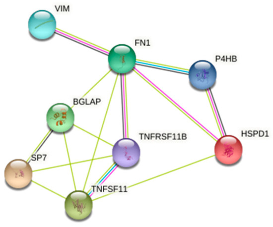 STRING analysis of protein interaction networks. Interactions of identified proteins were mapped by searching STRING database version 10.5 with a confidence cutoff of 0.4. In the resulting protein association network, proteins are presented as nodes connected by lines whose thickness represents the confidence level. Osteoblast differentiation-related genes BGLAP (OC), TNFRSF11B (OPG), SP7 (OSX), TNFSF11 (RANKL), and FN1 (fibronectin) were obtained from the qPCR data (Figure 3).