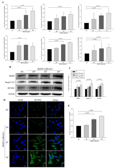 Cells were seeded on coverslips coated with 0.1% gelatin in a 24-well plate at a density of 1.25 × 104 cells/mL. After overnight incubation at 37 °C, the cells were starved in serum-free medium for 24 h and then treated with hkMJ2 (1 × 106, 1 × 107, or 1 × 108 cells/mL) for 14 days. The medium was replaced every 3 days. The cells were washed with PBS and then fixed with 4% paraformaldehyde at room temperature for 30 min. The cells were washed with PBS and then permeabilized with 0.1% Triton X-100 in PBS. Then, the cells were blocked with 10% normal donkey serum (NDS) at room temperature for 30 min. A primary antibody against RUNX2 (1:1000 dilution, ab23981; Abcam) in 2% NDS was diluted at 1:500 and applied at 4 °C overnight. The cells were washed with PBS and then incubated with a secondary antibody, goat anti-rabbit IgG DyLight 488 (1:1000 dilution, 35553; Thermo Scientific), in 2% NDS. Nuclei were counterstained with 4′,6-diamidino-2-phenylindole (Sigma) for 5 min and the coverslips were mounted with VECTASHIELD® (Vector Laboratories, Burlingame, CA, USA). Images were obtained under a C1 plus confocal laser scanning microscope (Nikon, Tokyo, Japan).