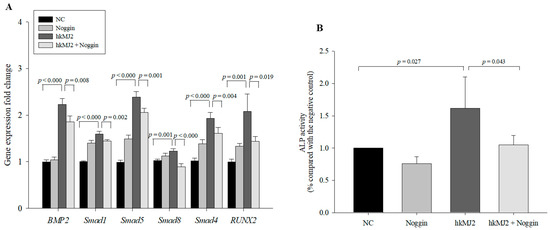 To examine whether hkMJ2 enhanced osteoblast differentiation via the BMP2/RUNX2 signaling pathway, we used the BMP inhibitor Noggin [33]. Although cells treated with the inhibitor alone did not show a significant inhibitive effect compared with the negative control, cells cotreated with 100 ng/mL Noggin (and 1 × 108 cells/mL hkMJ2 showed a significant decrease in mRNA expression compared with cells treated with hkMJ2 alone (Figure 6A). Additionally, ALP activity in cells cotreated with Noggin and hkMJ2 showed significant decreases compared with cells treated with hkMJ2 alone (Figure 6B). These results suggest that hkMJ2 promoted osteoblast differentiation via the BMP2/RUNX2 signaling pathway.