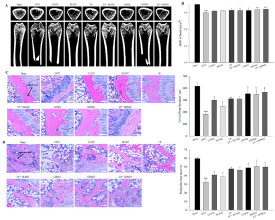 Effect of MJ2 and L. plantarum on osteoporotic bone mass and bone microarchitecture. 3D images of the femur of the hind limb were obtained by micro-CT (A). Bone mineral density (BMD) measured by dual-energy X-ray absorptiometry scanning was quantified (B). Bone microarchitecture (cortical bone (C) and trabeculae bone (D)) was analyzed by H&E staining and quantified (×100, scale bar = 100 μm). The values indicate the mean ± SEM. ### p < 0.001 compared with the sham group; * p < 0.05, ** p < 0.01, and *** p < 0.001 compared with the OVX group.