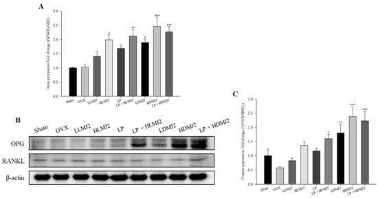 Gene and protein expression levels of OPG/RANKL did not significantly decrease in the OVX group compared with the sham group, whereas dead MJ2-treated groups showed significant increases in a dose-dependent manner compared with the OVX group (Figure 8).