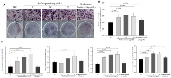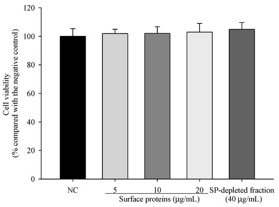 To investigate the cytotoxicity of surface proteins (SPs) and an SP-depleted fraction in hFOB 1.19 cells, cell viability was measured by the MTT assay. The viabilities of cells treated with 5, 10, and 20 μg/mL SPs or the SP-depleted fraction (40 μg/mL) did not show a significant reduction (Figure 9). Therefore, we used these concentrations of SP and the SP-depleted fraction in the following experiments.
