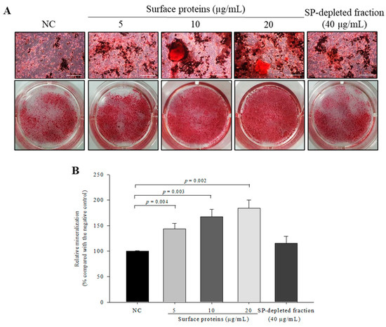 Effect of surface proteins extracted from P. freudenreichii MJ2 on osteoblast mineralization. Calcium deposits were stained by alizarin red S (×100, scale bar = 100 μm) (A) and quantified (B). Values indicate the mean ± SD of three independent experiments performed in triplicate.